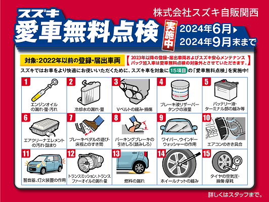 こんにちは 車検のコバック西店 俣本です 今年もスズキの愛車無料点検の時期がやってきました🚙 6月から9月までの4ヶ月間 15項目の点検を無料でいたします ...